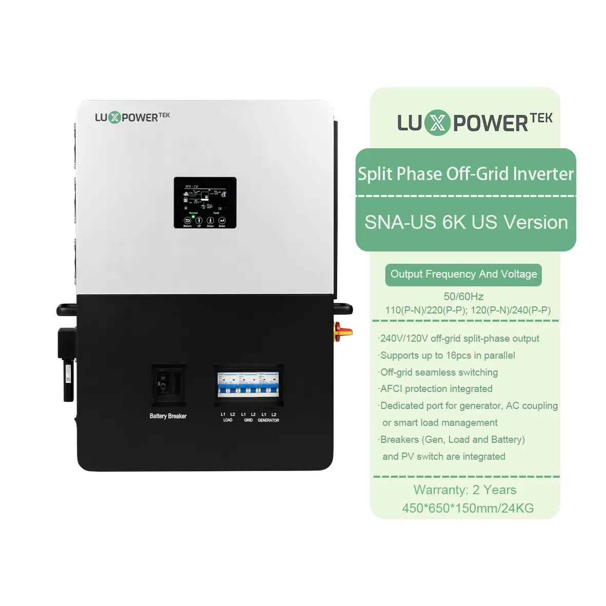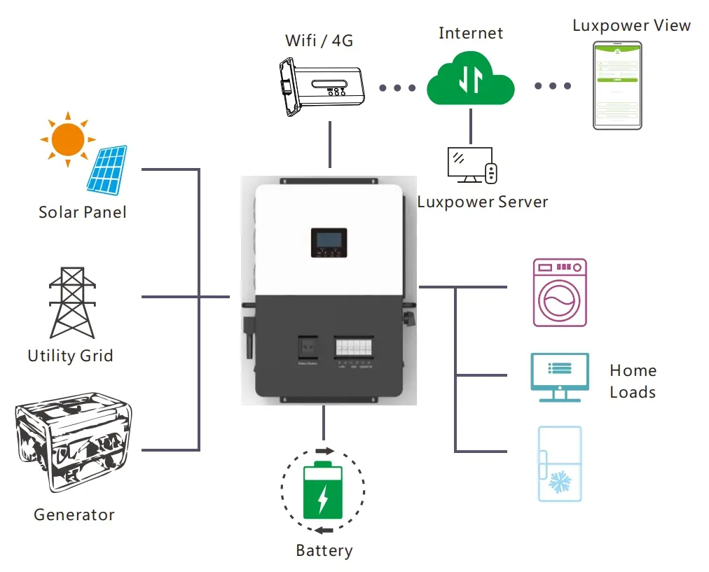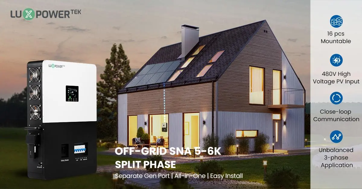 Présentation de l'onduleur Fashion Luxpower SNA US 6000: compact, intégré de manière transparente et conçu pour la production d'énergie connectée au réseau et autonome. Idéal pour les petits ménages, il garantit la fiabilité dans n'importe quelle condition, ce qui rend sans effort la vie hors réseau.